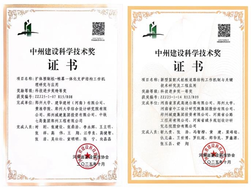 鄭州城建集團的“擴體預(yù)制樁—帷幕一體化支護(hù)結(jié)構(gòu)工作機理研究與應(yīng)用”與“新型裝配式樁板道路結(jié)構(gòu)工作機制與關(guān)鍵技術(shù)研究及工程應(yīng)用”兩項科研項目,分獲河南省“中州建設(shè)科學(xué)技術(shù)獎”特等獎和一等獎。