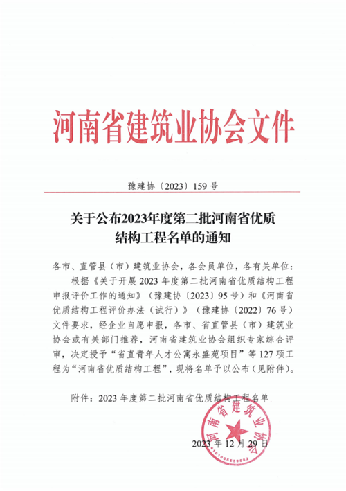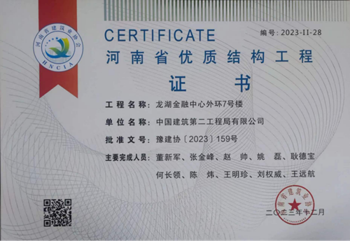 近日,河南省建筑業(yè)協(xié)會(huì )發(fā)布《關(guān)于公布2023年度第二批河南省優(yōu)質(zhì)結構工程名單的通知》(豫建協(xié)〔2023〕159號),城發(fā)·金岱智慧產(chǎn)業(yè)園二期和龍湖金融中心外環(huán)7號樓兩項工程順利通過(guò)專(zhuān)家組考評,榮獲“2023年度河南省優(yōu)質(zhì)結構工程”獎。