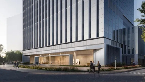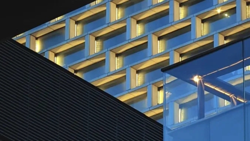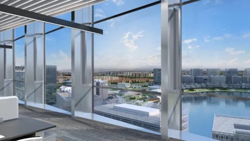 城發(fā)中心以“嵩山書(shū)頁(yè)巖”為設計理念,以中空LOW-E玻璃打造極簡(jiǎn)幕墻立面,玻璃寬約3米,隱藏式開(kāi)啟窗。