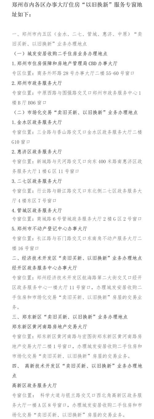 7月16日,記者從鄭州市房管局獲悉,為促進(jìn)該市房地產(chǎn)市場(chǎng)“賣(mài)舊買(mǎi)新、以舊換新”政策進(jìn)一步落實(shí),鄭州市房管局會(huì )同稅務(wù)、不動(dòng)產(chǎn)登記等部門(mén),認真梳理工作流程、全面開(kāi)設服務(wù)專(zhuān)區,全力推進(jìn)住房“以舊換新”工作。目前,鄭州市內8區10個(gè)辦事大廳均開(kāi)設“以舊換新”服務(wù)專(zhuān)窗,辦理相關(guān)業(yè)務(wù)可享受“專(zhuān)人專(zhuān)窗”的服務(wù)。