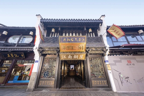 以朱炳仁團隊打造的銅屋系列為例:入駐亳都·新象的“中原銅屋”是其全國第四家、華中第一家銅屋。建筑內部以超高、超寬的銅板工藝打造出“銅盒子”視覺(jué)焦點(diǎn),磚木結構搭配著(zhù)銅與玻璃的碰撞,產(chǎn)生時(shí)空交錯的美感。“中原銅屋”整體風(fēng)格和中原民居相適配,當訪(fǎng)客的指尖掠過(guò)帶有紋飾的銅器,恰似完成一場(chǎng)跨越三千年的文明對話(huà)——要知道,商城遺址曾出土過(guò)杜嶺方鼎等商代青銅文明的巔峰之作,這份地域文化根脈在此得到了呼應。