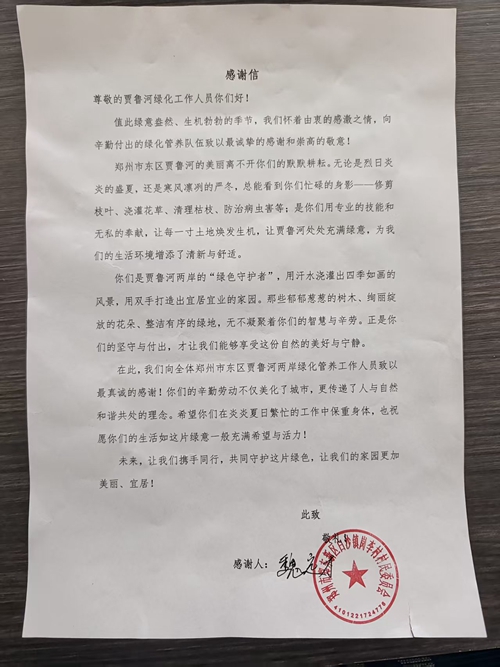 守護賈魯河的生態(tài)之美,是綠化養(yǎng)護人矢志不渝的責任與光榮使命。每一片蔥郁的樹林、每一處綻放的花海、每一聲清脆的鳥鳴,都見證著養(yǎng)護團隊的匠心與堅守。此次收到鄭東新區(qū)崗李村村委的錦旗和感謝信,令全體團隊倍感鼓舞。這不僅是對養(yǎng)護團隊專業(yè)能力的認可,更是對賈魯河生態(tài)治理成效的高度肯定。