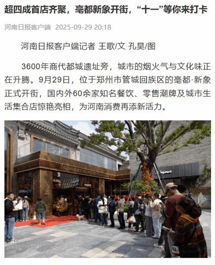 同時(shí),河南日?qǐng)?bào)、大河財(cái)立方、鄭州發(fā)布等多家媒體紛紛對(duì)“亳都·新象”開街盛況作了報(bào)道,尤其是對(duì)項(xiàng)目的“首店經(jīng)濟(jì)”現(xiàn)象做了重點(diǎn)關(guān)注。通過(guò)主流媒體和專業(yè)媒體的廣泛關(guān)注,以及市民和游客自發(fā)傳播,項(xiàng)目在互聯(lián)網(wǎng)上取得了1億+的累計(jì)曝光量。在河南日?qǐng)?bào)的報(bào)道中,分析“亳都·新象”激發(fā)商業(yè)活力的原因時(shí),記者指出,守好“老”的底色和文脈,拓展“新”的內(nèi)涵和意蘊(yùn),亳都·新象又潮又趣,通過(guò)“歷史場(chǎng)景+現(xiàn)代消費(fèi)”的創(chuàng)新模式,激活3600年商都文化基因,潛心打造中原地區(qū)文化商業(yè)新標(biāo)桿。